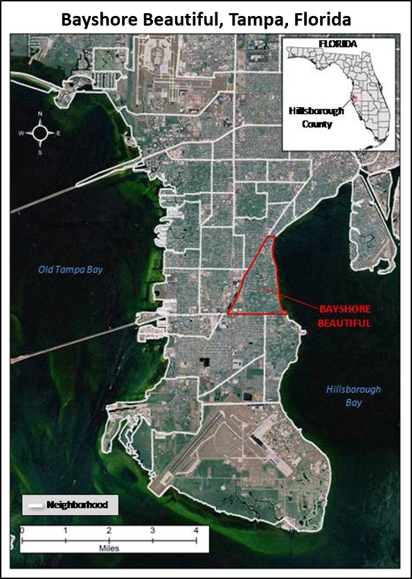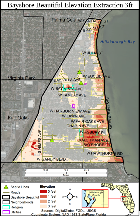 I created a test scenario which involves South Tampa in Hillsborough County, Florida (Figure 1) and managing data elements that fall within a specific neighborhood, Bayshore Beautiful. The AOI will then be further extracted by elevation values of 0-3 feet. General purposes for this test scenario include understanding what features of the neighborhood lie in areas of 0-3 feet which may have a higher chance to flood.