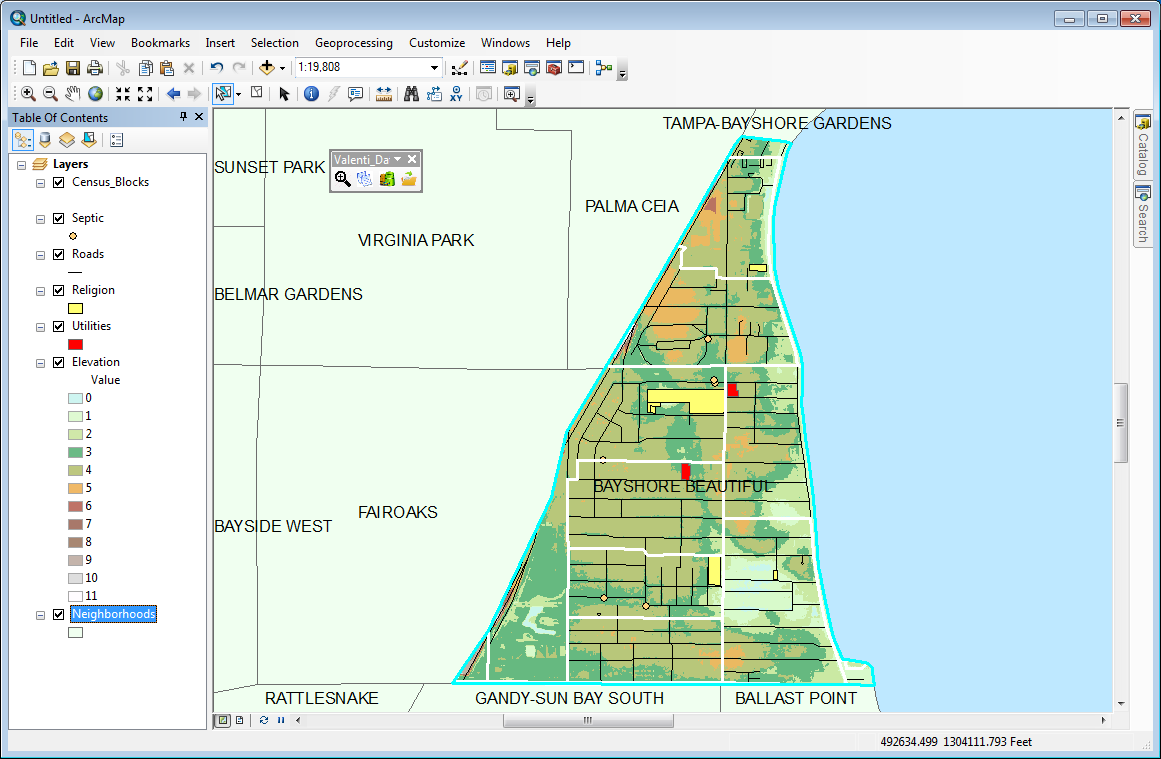 If installing the add-in, ensure the extension is checked (Customize>Extensions>Valenti Add Base Layer), and a new MXD should be opened. For the test case of South Tampa, the extension is used to present the base layer containing the neighborhoods for South Tampa when a new MXD is opened.