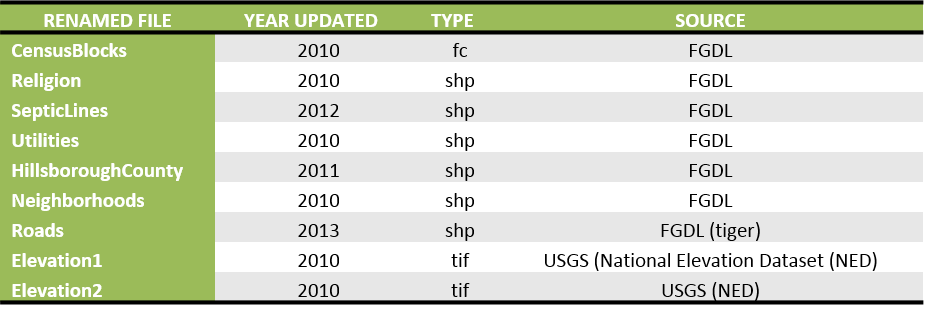The input data selected for this scenario includes free raster and vector data. In addition to elevation rasters from USGS, various shapefiles from the Florida Geospatial Data Library (FGDL) were selected to build up a preliminary dataset for Hillsborough County, Florida (Table 1).